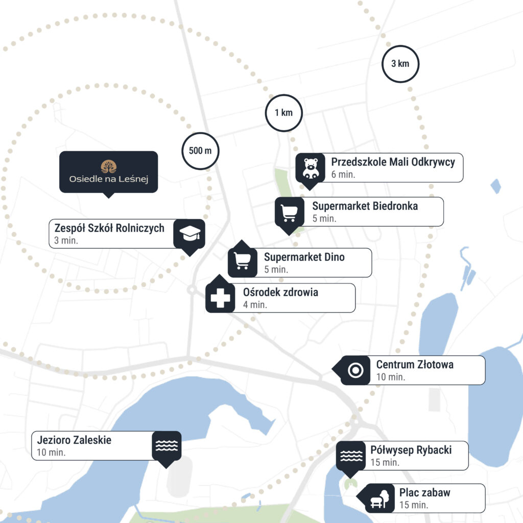 Osiedle na Leśnej zlokalizowane jest w cichej, spokojnej oraz zielonej okolicy, blisko lasu, miejskiej promenady, a także malowniczych zbiorników wodnych: Jeziora Zaleskiego i Jeziora Złotowskiego. To idealne miejsca na rowerowe przejażdżki, rodzinne spacery czy wypoczynek nad wodą. W pobliżu osiedla znajdują się także popularne markety, takie jak Dino i Biedronka, dzięki czemu możesz wygodnie zrobić codzienne zakupy. Jeśli masz lub planujesz dzieci, na pewno ucieszy Cię również komfortowy dostęp do kilku przedszkoli i szkół.